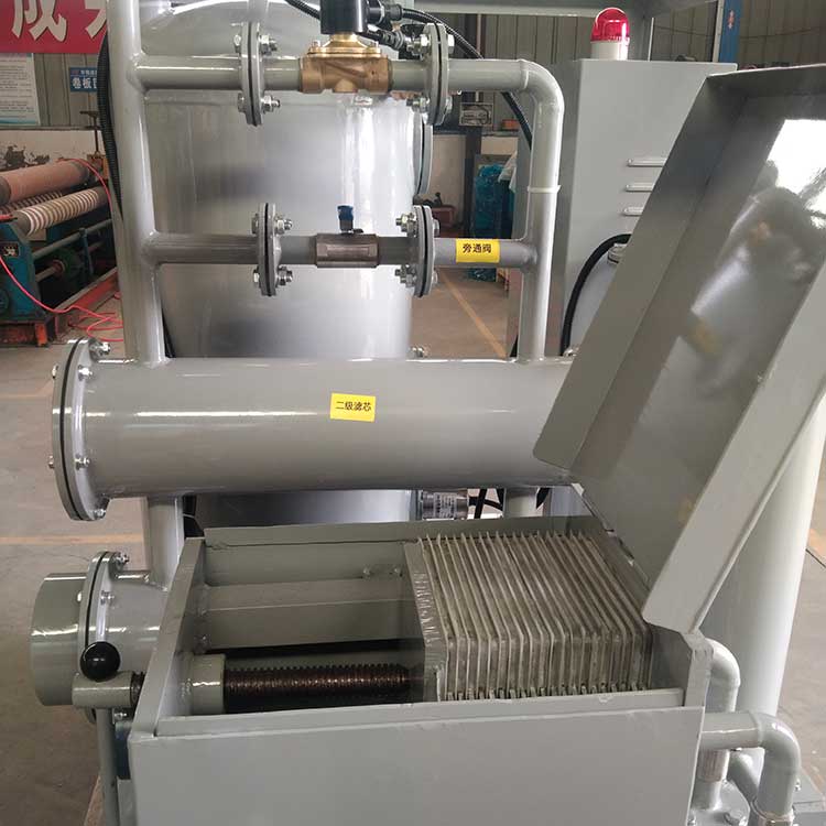 真空濾油機是根據水和油的沸點不同而設計的,它由真空加熱罐、精濾器、初濾器、真空泵、排油泵以及電氣柜組成的。真空泵將真空罐內的空氣抽出形成真空,外界油液在大氣壓力的作用下,經過油入口管道進入初濾器,清除較大的顆粒,然后進入加熱罐內經過加熱到40~75℃的油進入真空罐內,油中的水份急速蒸發成水蒸氣并連續被真空泵吸入油水分離器內,分離器內的水蒸氣經冷卻后還原成水后放出。在真空加熱罐內的油液被排油泵排入精濾器通過濾芯將微粒雜質過濾出來。從而完成真空過濾迅速除去油中雜質、水份、氣體的全過程,使潔凈的油從出口處排出機外。